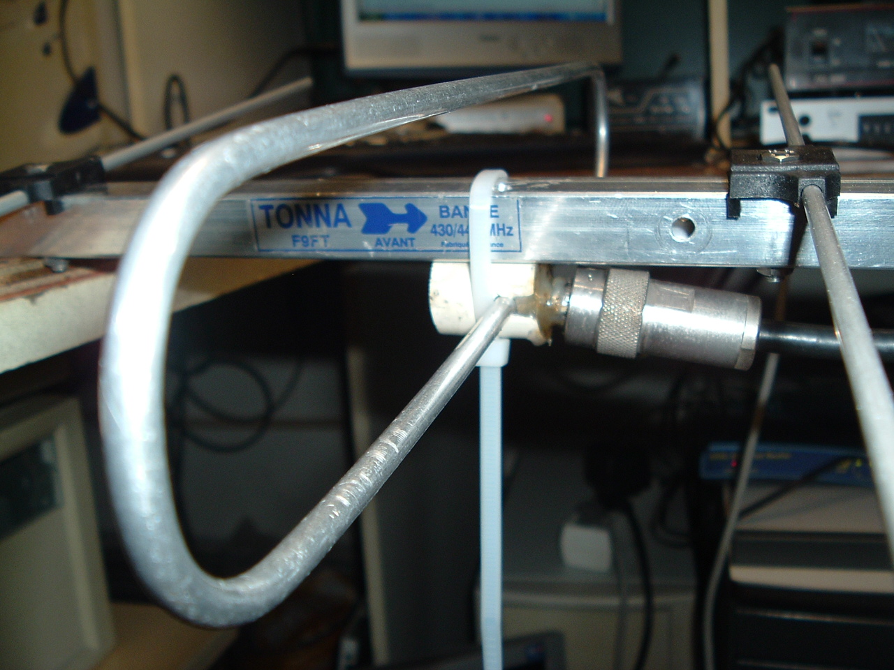 We hebben het vaak wel bevestigd aan de boom, omdat je dan ook de N-connector aan de boom kunt bevestigen. Zodoende heb je die ook gelijk met massa verbonden. Misschien heb je nog wat aan dit fotootje uit de begintijd van onze experimenten.