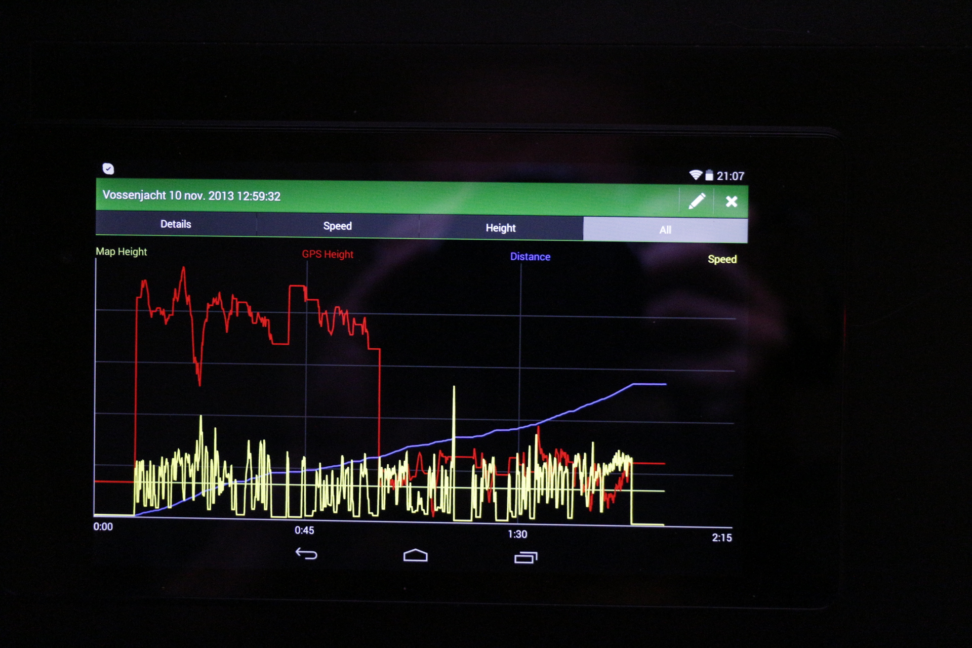 Screenshot van een 7 inch tablet met Viewranger. Geplot is een gelopen vossenjacht in Leusden.