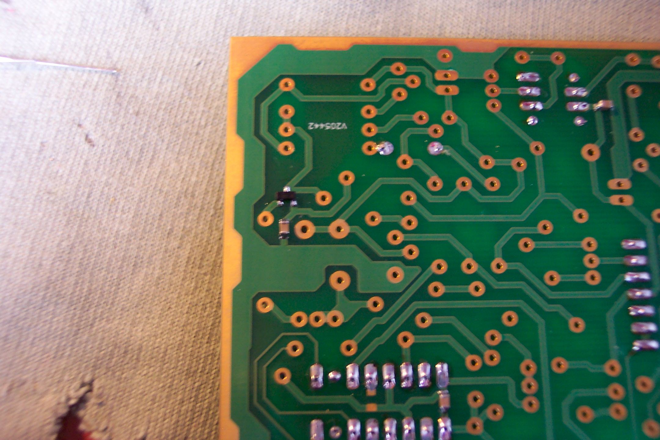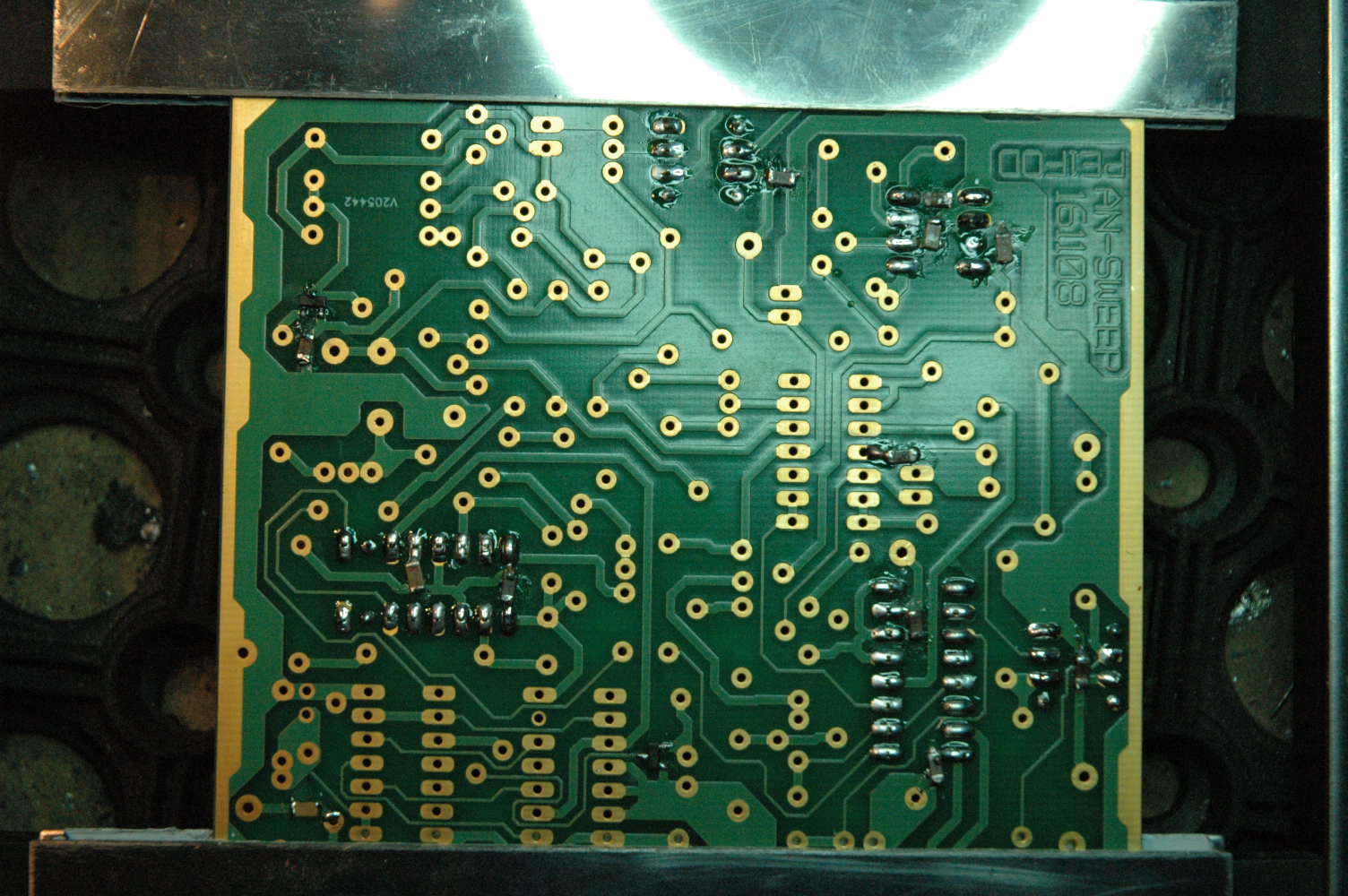 Begin met de SMD componenten aan de onderkant van de print. Vertin eerst één van de twee eilandjes en schuif met een pincet de soldeerkant van het onderdeel tegen dit druppeltje. Houd je bout er weer even bij en schuif nu het onderdeel in de vloeibare tin op zijn plaats. Vertin vervolgens de andere kant(en). Een heel klein beetje tin volstaat.