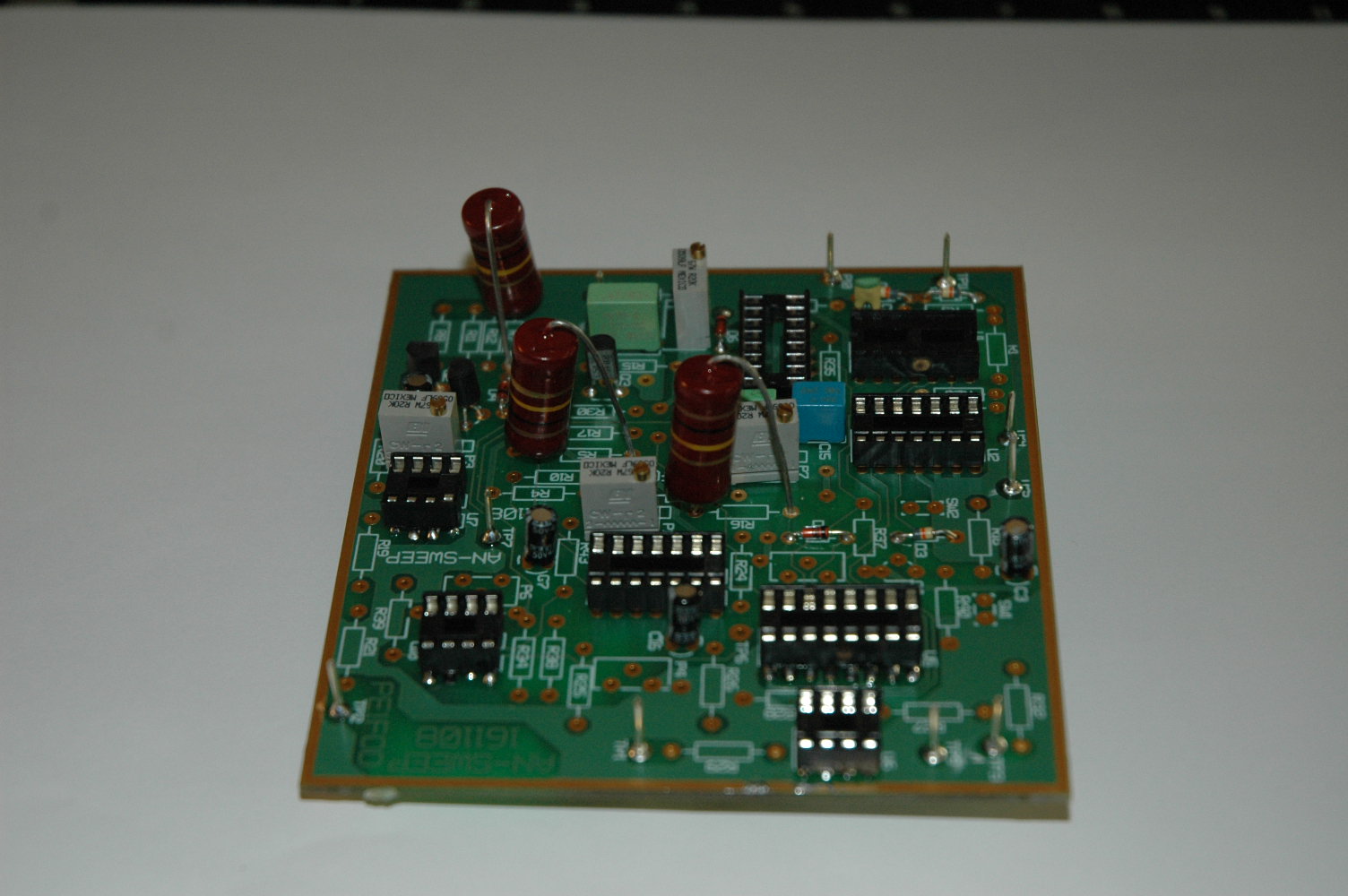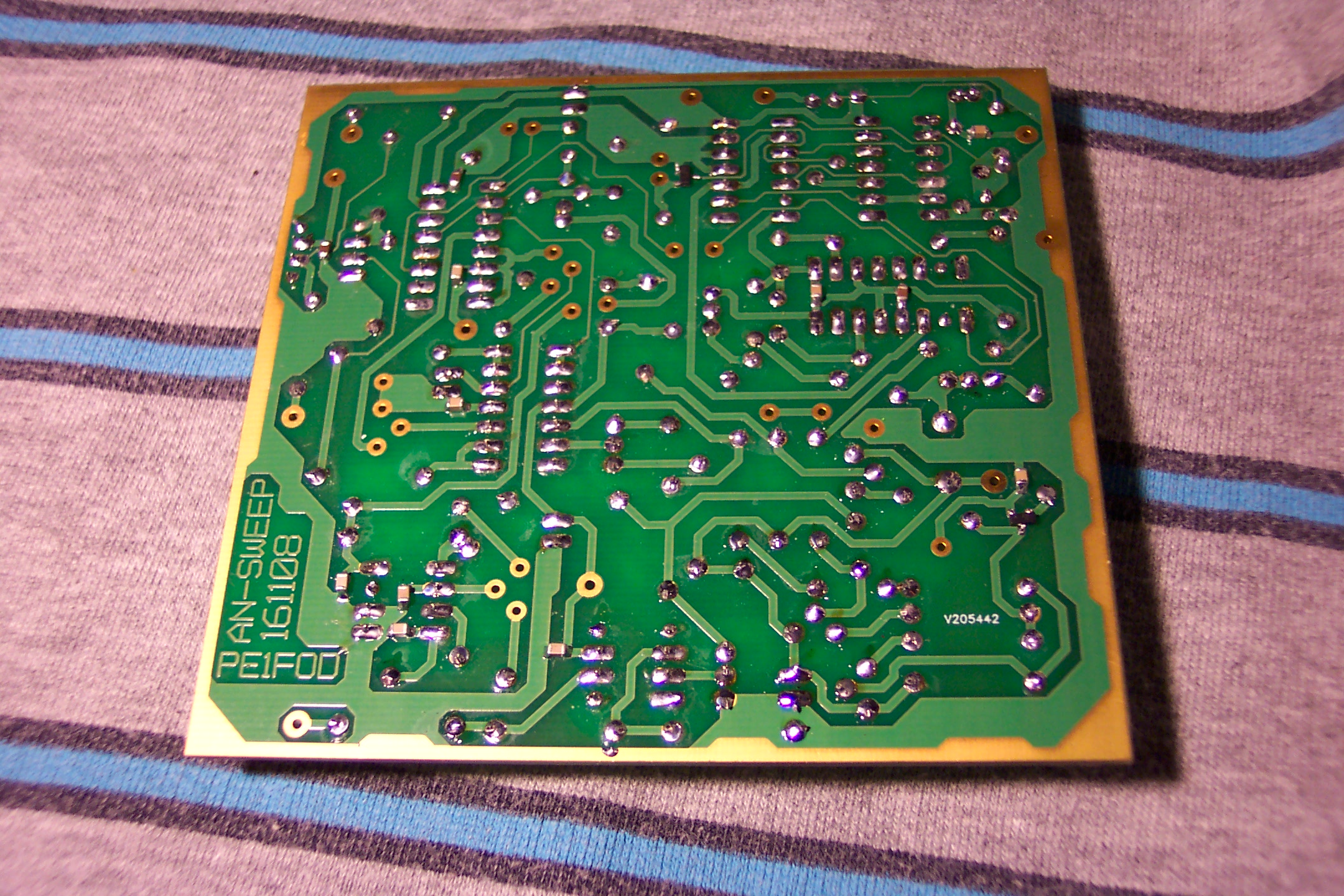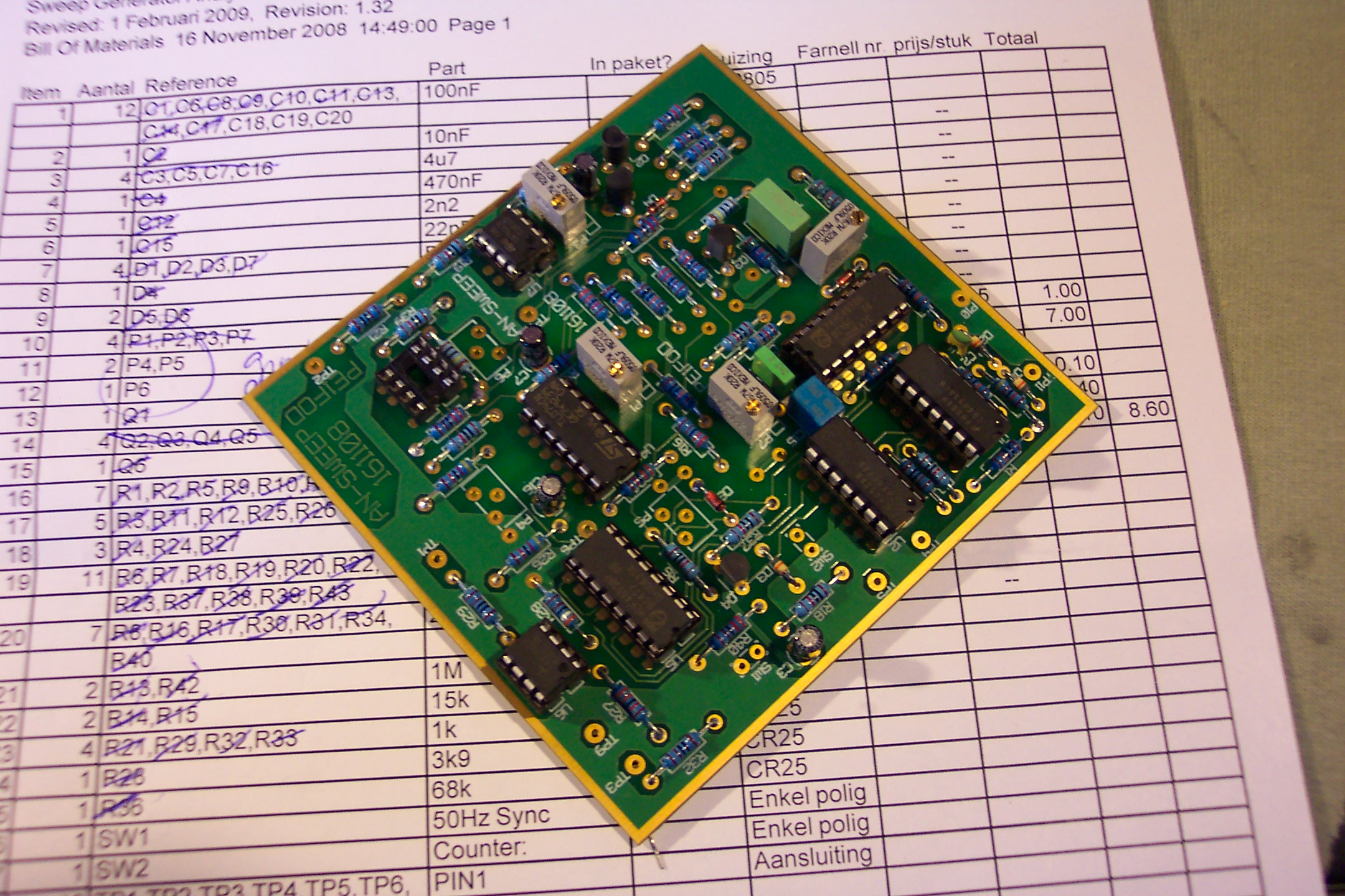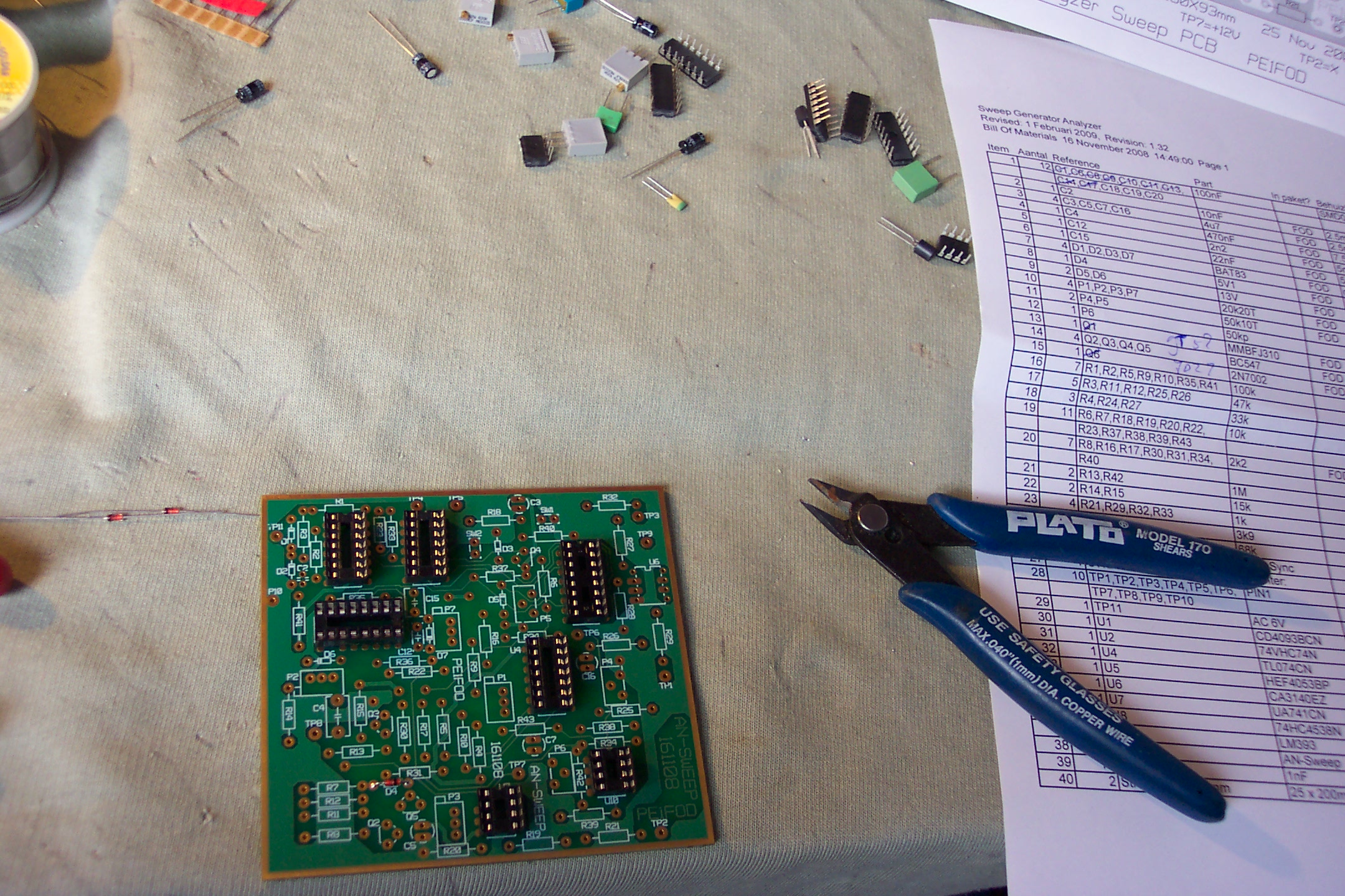 Daarna kun je beginnen met de bovenkant. Open het document "AN-Sweep-cmp-top132a.pdf" als hulp voor het geval je de opdruk van de print niet goed kunt lezen. Ook de polariteit van de elko's staan alleen in dit document en niet op de print. In dit document kun je ook zien welke potmeters en schakelaars extern moeten komen (zie rand van het document).