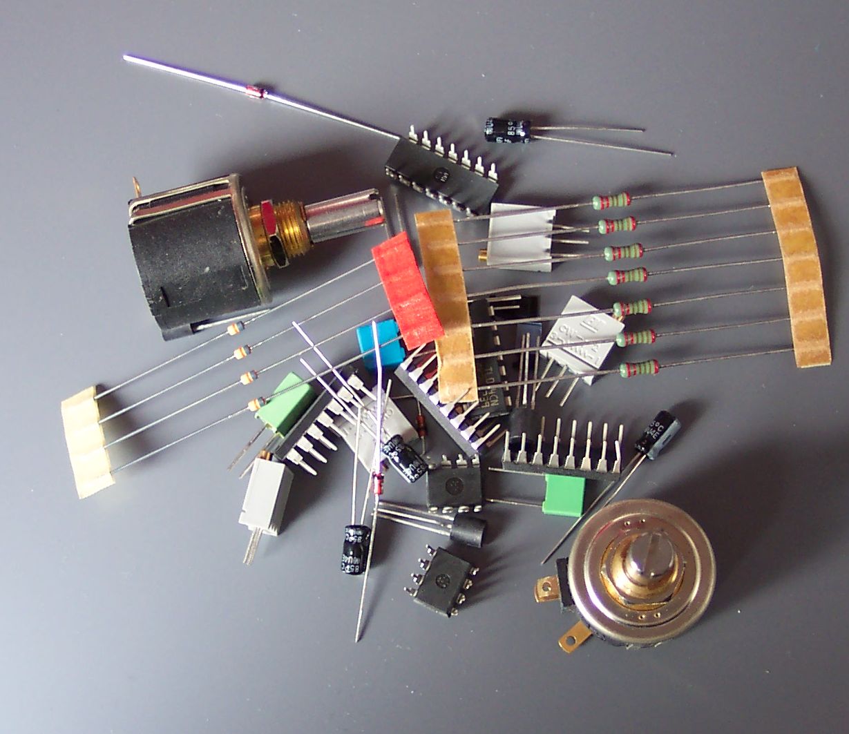Begin eerst met de lage onderdelen. IC's kun je eventueel in voetjes plaatsen. Ik gebruik bij voorkeur metaalfilm weerstanden, vandaar de extra kleurrand op de weerstanden in onderstaande foto's. Door de weerstanden consequent op dezelfde manier te monteren (bijvoorbeeld met tolerantierand naar rechts, of boven), kun je straks eventueel makkelijker foutzoeken. Verder vind ik het handig om op de lijst gelijk weg te strepen wat ik al heb gemonteerd. Let er bij het plaatsen van de 4u7 elko's op, dat er één van de vier andersom gemonteerd moet worden (C5 met plus naar onderkant gericht). Oftewel, houd goed de polariteit in de gaten. SW1, SW2, P4, P5, P6 komen extern, dus zoek je niet rot naar een juist model. P4 en P5 zijn de meerslagenpotmeters waar je straks aan de buitenkant mee gaat regelen (mogen ook 100k zijn). P6 is voor de marker.